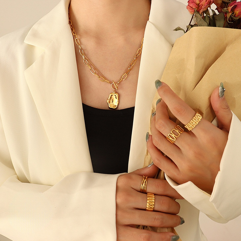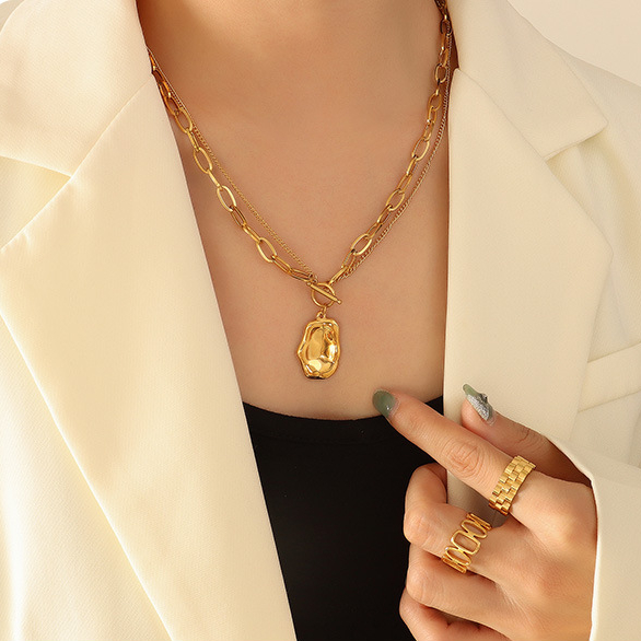 Bold chain and skinny chain spliced together, presenting that stacking look! Irregular shape pendant also gives that modern fashion style! OT buckle structure makes it easy to put on and take off! Spice up your daily outfit!
