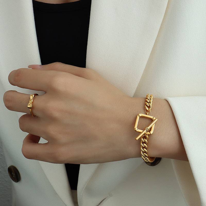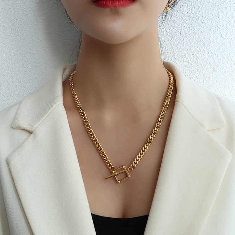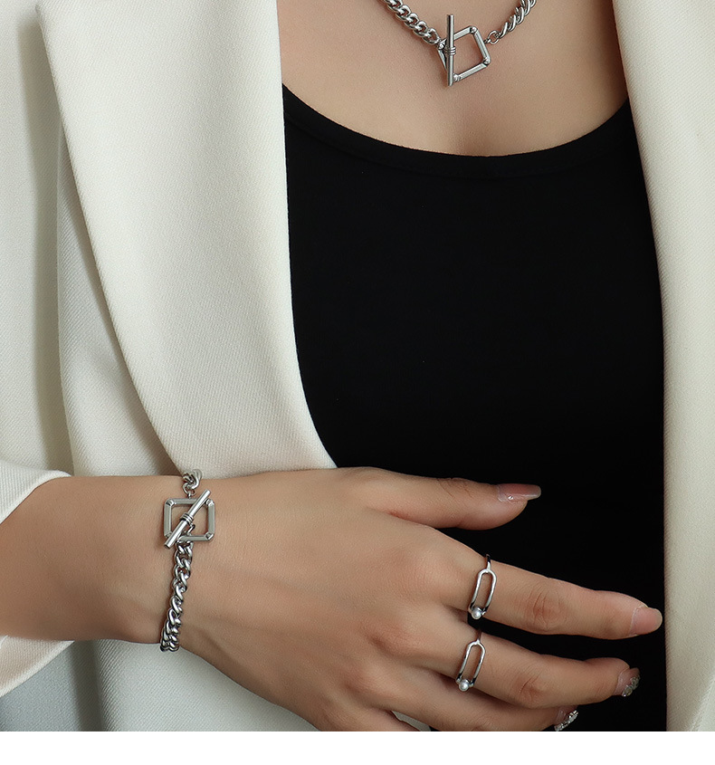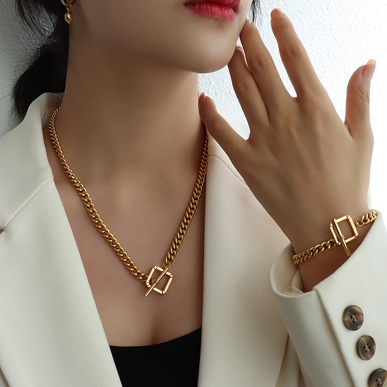 A statement set that has some features. OT buckle structure makes it pretty easy to put on and take off. The chunky chain outlook presents a hardcore rocky style. Spice up your daily outfit!